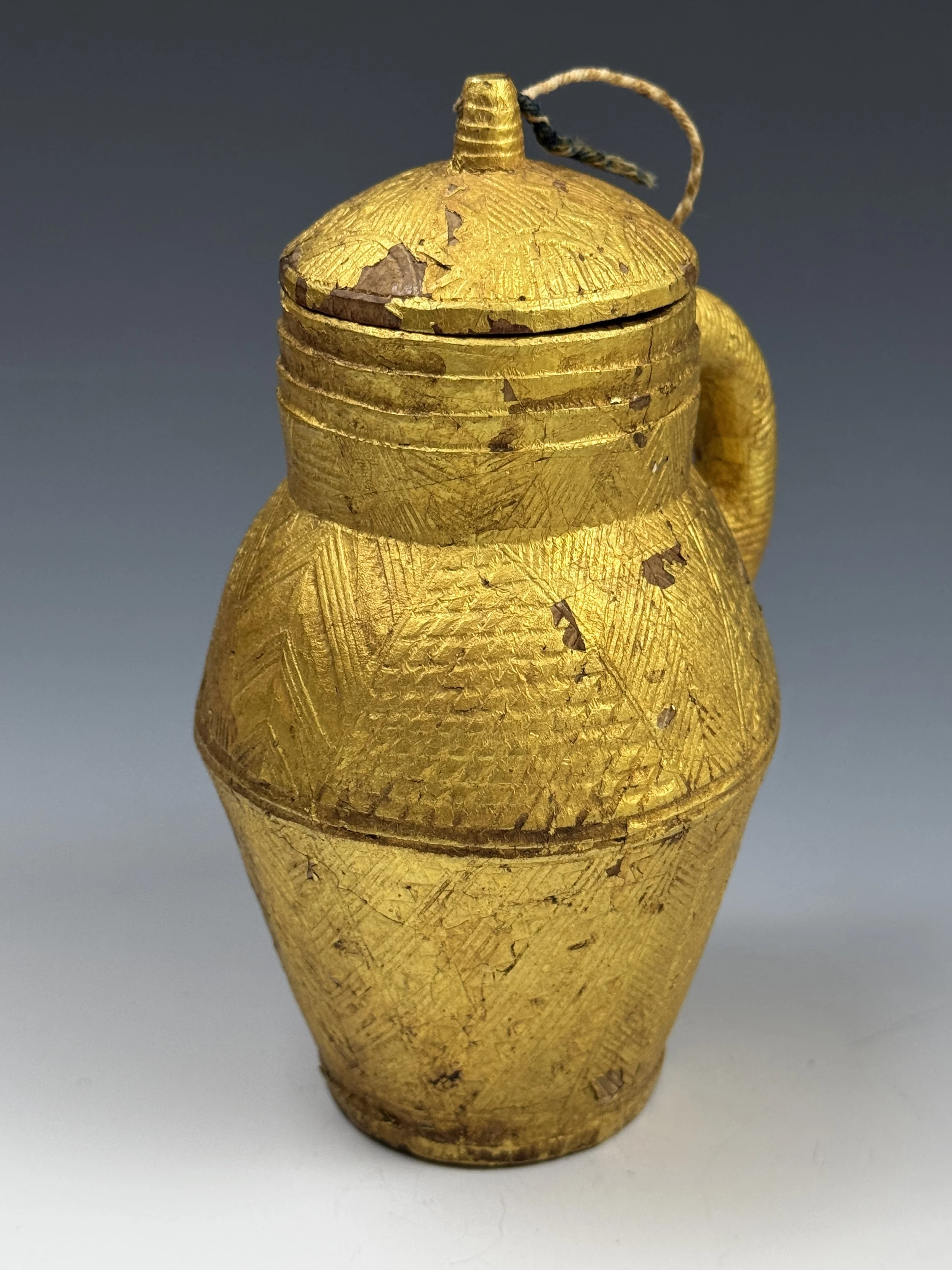 A Baule prestige object. This miniature wood carving covered with gold foil is a functional representation of a ceramic lidded vessel with intricate carved designs throughout the surface of the container. 16cm H. Ex Galarie Noir d'Ivoire, Paris, Ex Galerie Walu, Basel.